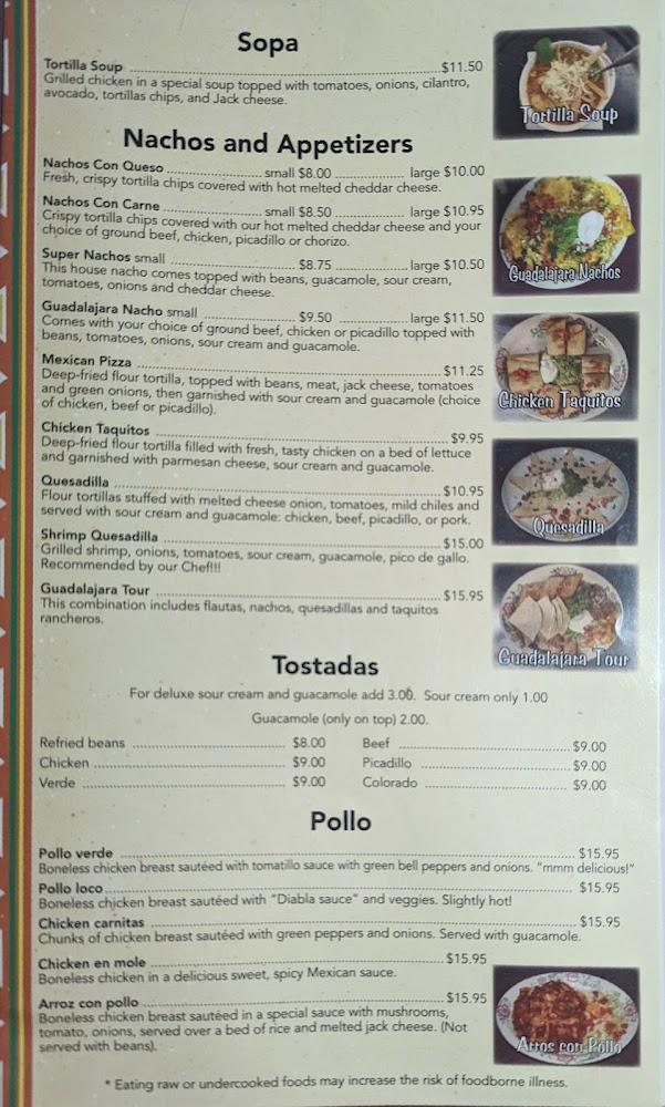 Guadalajara Grill's menu showcases a vast array of traditional Mexican dishes. From breakfast to dinner, the selection promises satisfaction. Breakfast highlights include fluffy chilaquiles and savory breakfast burritos. For lunch and dinner, options abound, including mouth-watering fajitas, tacos, and enchiladas. Vegetarian choices also shine with flavorful plant-based dishes. The innovative drinks menu features everything from classic margaritas to refreshing limeades. Desserts like churros and homemade flan round out the meal, ensuring a sweet end to your visit. Whatever you choose, each dish reflects the restaurant's dedication to quality and authenticity.